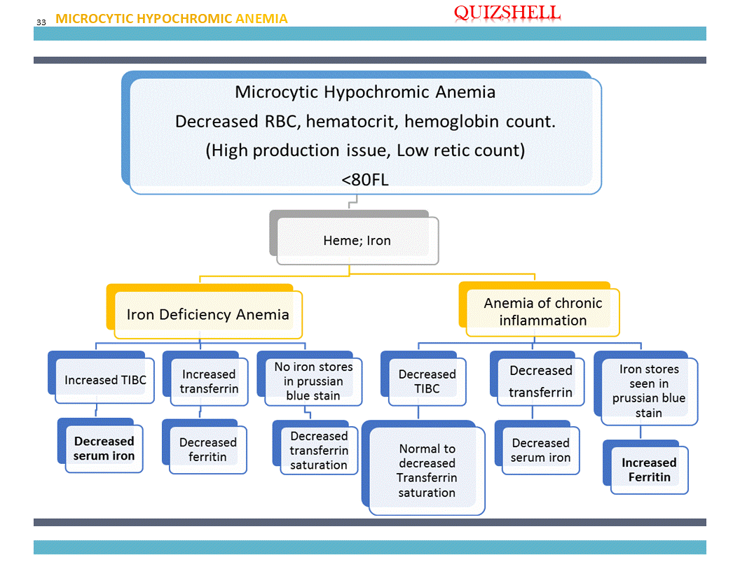 Microcytic Hypochromic Anemias Leave a Comment / By quizshell / October 25, 2021 1234567891011121314 0% 0 votes, 0 avg 20 GOOD LUCK WELL DONE Created by quizshellMicrocytic hypochromic Anemias 1 / 14 Category: Hematology 1. Which of the following is the major transport protein of iron ? A. Transferrin B. Ferritin C. Hemosiderin D. Haptoglobin 2 / 14 Category: Hematology 2. Calculate percent transferrin Serum iron is 22 μg/dL TIBC is 180 μg/dL A. 17% B. 25% C. 12% D. 15% Transferrin Saturation %= Serum iron x 100 / TIBC 22 X 100 / 180 3 / 14 Category: Hematology 3. Impaired release of storage iron due to increased hepcidin levels will result in ? A. Thalassemia B. Sideroblastic anemia C. Anemia of Chronic Inflammation D. Iron-deficiency anemia 4 / 14 Category: Hematology 4. Serum ferritin is an indirect measurement of A. Tissue iron B. Storage iron C. Hemoglobin iron D. Transferrin iron 5 / 14 Category: Hematology 5. Microcytic, hypochromic red cells are most often associated with impaired A. DNA synthesis B. Hemoglobin synthesis C. RNA metabolism D. Enzyme metabolism 6 / 14 Category: Hematology 6. Total iron binding capacity (TIBC) measures A. Amount of transferrin B. Amount of iron that transferrin can bind C. Hepcidin D. Ferritin 7 / 14 Category: Hematology 7. A 25-year-old woman complains to his physician of extreme fatigue. Her CBC results are as follows: WBC 6.8 x 10^9/L RBC 3.9 x 10^12/L Hemoglobin 9.2 g/dL Hematocrit 30% MCV 77fl MCH 24 pg MCHC 31 g/dL Serum Iron Ferritin RDW TIBC Prussian blue stain Decreased Decreased Decreased Increased Absent iron stores The results of the CBC and iron studies, in this case, are most characteristic of? A. Iron deficiency B. Megaloblastic anemia C. Sideroblastic anemia D. Anemia of chronic disease 8 / 14 Category: Hematology 8. Which of the following characterizes iron deficiency anemia? A. Decreased serum iron, increased transferrin saturation, normal ferritin B. Increased serum iron, decreased transferrin saturation, decreased ferritin C. Decreased serum iron, decreased ferritin and Increased TIBC D. Increased serum transferrin, increased ferritin, and decreased Total iron binding capacity (TIBC) 9 / 14 Category: Hematology 9. A 21-year-old woman complains to his physician of fatigue, dizziness, and craving for ice. Her results are as follows: Based on her laboratory result, what is the cause of anemia? WBC 4.8 x 10^9/L RBC 3.75 x 10^12/L Hemoglobin 9.8 g/dL Hematocrit 29% MCV 77.3 fL MCHC 33.8 g/dL Serum iron and ferritin is decreased Elevated total iron-binding capacity (TIBC) Blood smear shows microcytic hypochromic red blood cells A. Anemia of Chronic Inflammation B. Sideroblastic anemia C. Iron-deficiency anemia D. Megaloblastic anemia 10 / 14 Category: Hematology 10. Defective nuclear maturation commonly results in the production of red cells that are ? A. Normocytic B. Hypochromic C. Macrocytic D. Microcytic 11 / 14 Category: Hematology 11. Which of the following characterizes anemia of chronic inflammation? A. Serum iron Increased, transferrin decreased, and increased ferritin B. Serum iron decreased, transferrin decreased, and decreased ferritin C. Serum iron increased, Increased transferrin, and decreased ferritin D. Serum iron decreased, ferritin increased, and decreased Total Iron Binding Capacity(TIBC) 12 / 14 Category: Hematology 12. Which protein regulates iron homeostasis ? A. Hemosiderin B. Transferrin C. Hepcidin D. Hemopexin 13 / 14 Category: Hematology 13. A 27-year-old woman complains to his physician of pain and fatigue. Her results are as follows: WBC 5.4 x 10^9/L RBC 3.9 x 10^12/L Hemoglobin 8.2 g/dL Hematocrit 28% MCV 72 fL MCHC 29.3 g/dL ESR increased Serum iron and total iron-binding capacity (TIBC) both decreased Serum ferritin slightly elevated. Presence of Prussian-blue-stainable iron in bone marrow was also noted. Based her laboratory result, what is the cause of anemia? A. Sideroblastic anemia B. Anemia of Chronic Inflammation C. Iron-deficiency anemia D. Megaloblastic anemia 14 / 14 Category: Hematology 14. Impaired DNA metabolism is characteristic of which type of anemia ? A. Thalassemia B. Sideroblastic anemia C. Megaloblastic anemia D. Iron-deficiency anemia Your score is LinkedIn Facebook Twitter VKontakte 0% Restart quiz Send feedback More Quizzes Hematology Test Bank 224 Questions; Clinical Chemistry Question Banks Endocrinology Quiz Acid Base Balance Electrolyte and Osmolality Quiz Cardiac and Liver Enzymes Carbohydrates Quiz Lipids and Lipoproteins Parasitology Question Bank Filariae Quiz Nematodes Cestodes Quiz Trematodes Quiz Flagellates and Ciliates Quiz Hemoflagellates Extraintestinal Protozoa Quiz Share this: Share on X (Opens in new window) X Share on Facebook (Opens in new window) Facebook Like this:Like Loading...